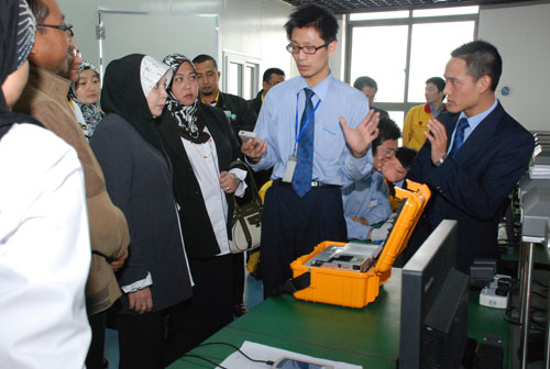 In the accompany of Dr. Liu Zhao Gui, ministry Dr. Mashitah Ibrahim and her fellows visited Chemical Lab and Workshop of X-ray fluorescence products. When she saw the new products likes EDX880, EDX800, Portable-1 and so on, she is so glad that she happily took her rivale and put it into the instrument for analysis. “Beautiful appearance, fast analysis, accurate, indeed the crystallization of Skyray high technology.” So eulogized the ministry.